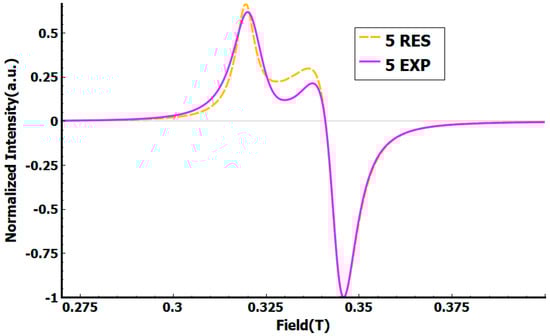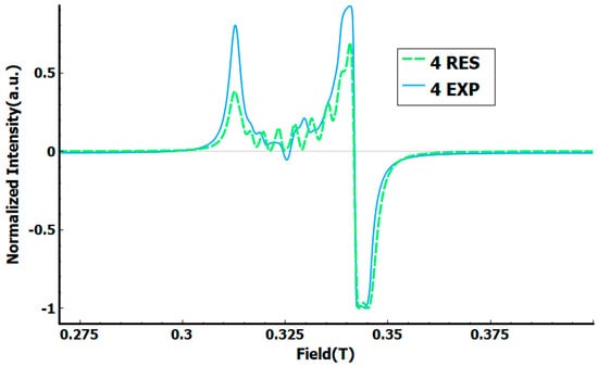 To explore the possibility of the practical application of synthesized complexes as contrast agents for MRI, electron paramagnetic resonance (EPR) analysis was conducted on the solid-state samples of complexes 4 and 5. Additionally, complexes 4 and 5 were soluble and stable in a PBS buffer with physiological pH, showing the opportunity to apply 4 and 5 as MRI contrast agents. On the other hand, 6 and 7 were not soluble in PBS buffer so they are not soluble in physiological conditions, as they precipitated and the blue solution disappeared. To better understand the magnetic behavior of 4 and 5, we used PHI [] to simulate the EPR of 4 and 5 at frequencies of 9.831 GHz for 4 and 9.868 GHz for 5 to delve into the magnetic properties of these complexes. The consideration of anisotropic and/or isotropic systems was essential, as these terms describe the magnetic interactions experienced by unpaired electrons in a paramagnetic sample. In isotropic systems, the magnetic properties are uniform, while in anisotropic systems, these properties are direction-dependent []. Given the distinct shapes of our complexes, anisotropic systems were chosen for the simulations. For complex 4, the gx, gy, and gz values were determined as 2.247, 2.054, and 2.031, respectively. On the other hand, the gx, gy, and gz values for 5 were found to be 2.207, 2.049, and 2.049, respectively. The simulation calculated for each complex, referred to as 4 RES and 5 RES, was then compared with the experimental data (4 EXP and 5 EXP). In the case of complex 5, a notable correlation was observed between the simulated and experimental plots, showcasing close alignment with a few outliers (Figure 8). Conversely, for complex 4, while some points exhibited similarity between the two plots, a larger number of outliers were identified (Figure 9). The discrepancies observed in the plots point to distinctive effects arising from the varied molecular behavior and magnetic properties exhibited by the complexes. The chemical environment of 4 and 5 is undoubtedly influenced by the presence of Chlorine and Bromine atoms within the complexes changing their respective EPR spectra.