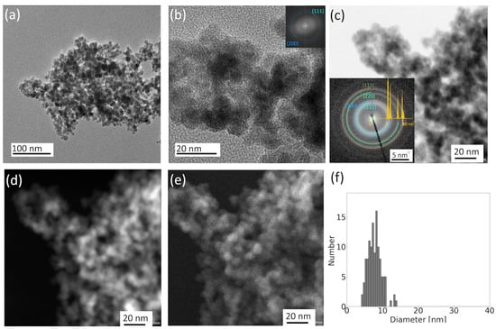 Images in the HAADF (Figure 1d) and SE (Figure 1e) detectors provide additional information about the thickness and surface morphology. The total number of particles of the agglomerate exceeding 2000 can be roughly estimated from these images. Regarding the size distribution of these nanoparticles, as depicted in Figure 1f, their diameters range from 4 to 14 nm, with an average value of 8 nm and a standard deviation of 2 nm.