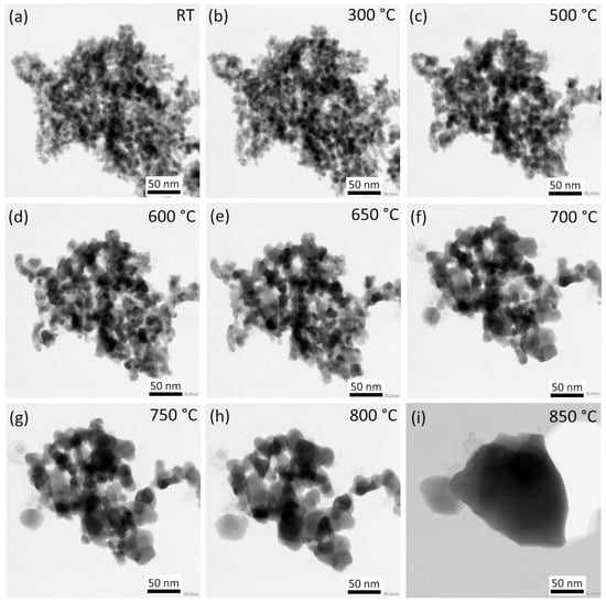 In situ annealing of the nanoparticle agglomerate. STEM BF images in the temperature range of 25–850 °C: (a,b) initial stages of sintering, (c–h) coalescence of smaller particles, and (i) coalescence of the whole agglomerate into a single particle.