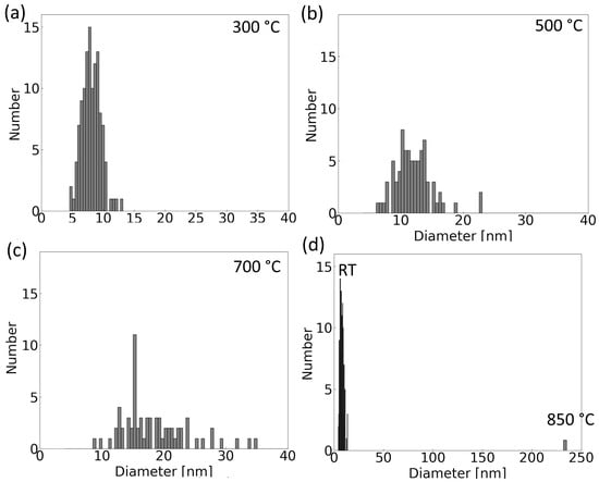 Histograms of the size distribution of particles in the agglomerate in Figure 2 at chosen temperatures: (a) 300 °C, (b) 500 °C, (c) 700 °C, and (d) 850 °C compared to the room temperature. The total number of particles decreases with increasing temperature.