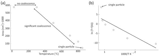 Analysis of the surface area of the annealed agglomerate: (a) change in the estimated surface as a function of temperature, the ranges where no coalescence, coalescence of smaller particles, and coalescence of the whole agglomerate are indicated in the plot; (b) Arrhenius plot according to Equation (2). The solid line represents the linear regression of the measured data (empty circles). The initial and final areas (points marked as a single particle) were not used in the fit.