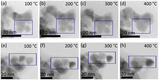 The details of the initial phases of sintering under 450 °C are depicted in Figure 6. Figure 6a–d capture the merging of particles of various sizes, forming larger aggregates, specifically a 7 nm, and a 6 nm particle with a larger 10 nm particle at a temperature of 300 °C. The increase in temperature to 400 °C facilitates the merging of slightly larger particles between 13 and 15 nm, as shown in Figure 6e–h. Both particle size and temperature significantly influence the initial stages of particle coalescence, forming larger, more consolidated structures.