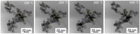 The TEM observations indicate a noticeable change in particle shapes at given temperatures. The images were captured within a few seconds, a time range resulting from the time required to acquire an STEM image. Consequently, this timeframe restricted the ability to detect processes that occurred faster. Each temperature was held for several minutes, allowing slower processes to come into play. When taking the values of gamma and D as constants from the established literature values, the characteristic sintering time as a function of temperature for different values of particle radii can be computed from Equation (1). For the sintering of particles with a diameter under 10 nm, a characteristic sintering time of 100 s is expected at room temperature, while it decreases to several seconds at 300 °C. The estimated characteristic sintering time ranges from seconds to hundreds of seconds for particles with diameters under 20 nm and temperatures over 500 °C. Sintering time estimates obtained from molecular dynamics simulations [29,40] cannot be directly applied to match the experimental results due to the significantly smaller particle sizes and higher temperatures involved in the simulations.