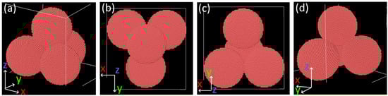 Ovito visualization of the initial configuration of a pile of nanoparticles used in MD simulations: (a) front, (b) up, (c) down, and (d) back views.