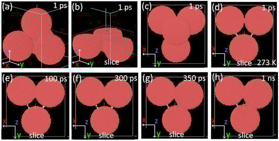 Ovito visualization of results of MD simulations of the nanoparticles annealing at 273 K. (a–c) A 1 ps of simulation: (a) front view, (b) how the pile was sliced for a better view, (c) top view, and (d–h) top view sliced at different timesteps. White arrows mark the distance between individual particles.
