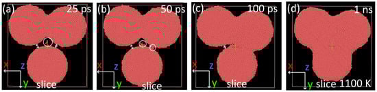 Aside from the whole body motion at a high temperature of 1100 K (Figure 10), the traveling of individual atoms from the surface of the particles through the interspace between two particles can be detected. By combining these mechanisms, particles meet and coalesce into a single mass (Figure 10d). The initial contact and neck formation between initially non-touching particles occur in a shorter time (100 ps) than during the room temperature annealing (350 ps). This is a result of particle motion and rotations caused by attractive van der Waals forces [42] and energy minimization by lattice rotations between all four particles in the pile. After the contact, the neck growth continues, and the sintering time obeys predictions based on diffusion mechanisms.