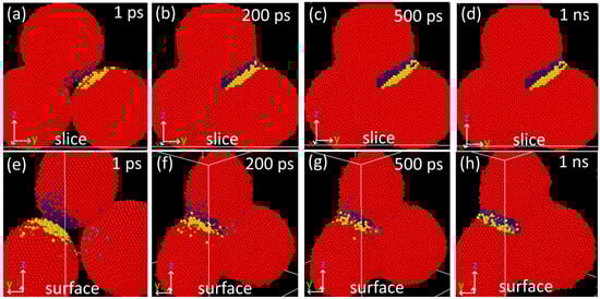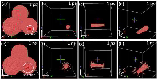A selection of atoms from the vicinity of the neck of two joined particles was made at one ns of simulation (Figure 11d,h). Images of this particle selection at lower simulation times (Figure 11a–h) indicate the original position of atoms contributing to the necking. Most of these atoms are close to the contact area (the distance is lower than four lattice parameters—Figure 11a). Surface atoms are the only ones traveling more considerable distances (Figure 11f). Thus, the maximum final displacement of inner atoms is approximately 1.4 nm, while the final displacement of surface atoms can reach 4 nm.