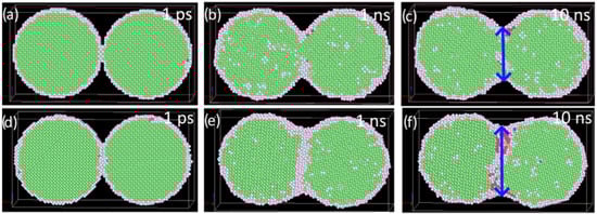 Sintering of two particles at 1100 K for two different particle orientations: (a–c) same initial orientation of particles; (d–f) differently oriented nanoparticles ([100], [010], [001], and [1–10], [001], [110] directions parallel to x, y, and z axes). The atoms are colored according to the common neighbor analysis: green—fcc, red—hcp, and gray—not defined lattice structure. The final length of the sintered particles is marked by a blue arrow.