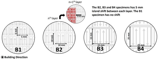 Schematic representation of island scanning strategy with varying island sizes used for laser powder bed fusion. The gray arrow indicates the laser rastering within the island, and the black arrow represents the 5 mm shift introduced for B2, B3, and B4 specimens.