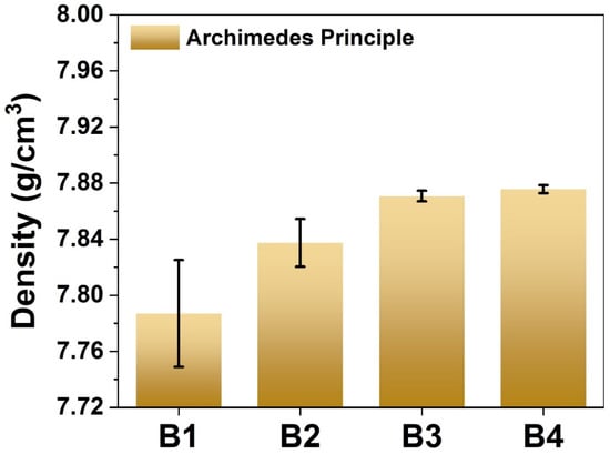 Density of B1, B2, B3 and B4 specimens, evaluated following Archimedes principle.