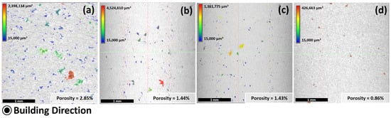 The densities of the B1, B2, B3, and B4 specimens, measured following Archimedes’ principle, are presented in Figure 2. Although all the LPBF specimens exhibited high density, an increasing trend in density with increased island size was observed. X-ray computed tomography scans were conducted on a single island for each of the B1, B2, B3, and B4 specimens to investigate the porosity percentage. The images in Figure 3a–d reveal the slice inside a single B1, B2, B3, and B4 island, respectively. The XRCT scans showed a decrease in porosity with increased island size, i.e., B1—2.85%, B2—1.44%, B3—1.43%, and B4—0.86%, which is in accordance with density measurements.