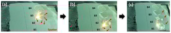 Figure 4 represents the images of B1, B2, B3, and B4 specimens taken during the LPBF process. As observed in Figure 4, the order of laser melting is B4 > B3 > B2 > B1. During the LPBF process, the phenomenon where powder particles are ejected and scattered around the build area is called spatter. Spatter can be of different types based on the formation mechanisms mentioned in the introduction; these types include solid spatter, metallic jet spatter, powder agglomeration spatter, entrainment melting spatter, and defect induced spatter [44,45,46]. As illustrated in Figure 4a–c, during the printing of B4, the resulting spatter was deposited on the powder beds of B3, B2, and B1, whereas the spatter generated during B3 printing was deposited on the powder beds of B2 and B1. Similarly, during B2 printing, the generated spatter was deposited on the powder bed of B1. Lastly, B1 was printed. This sequence of events revealed that the highest spatter deposition occurred in B1, while the lowest deposition was observed in B4. The deposited spatter can create quick fusing with the surrounding powder particles, causing pockets of trapped gas and uneven or incomplete melting, resulting in voids or gaps. Spatter can also reduce the bonding between layers, causing lack-of-fusion pores during LPBF melting. Spatter can also provide pathways for the development or growth of pores or voids, leading to higher porosity. Collectively, these phenomena can all cause high porosity in LPBF specimens. Moreover, spatter can also create irregularities and surface imperfections during LPBF printing, resulting in a poor surface finish. Therefore, less spatter deposition on the B4 powder bed favored higher density; in contrast, high spatter influence reduced the B1 specimen density.