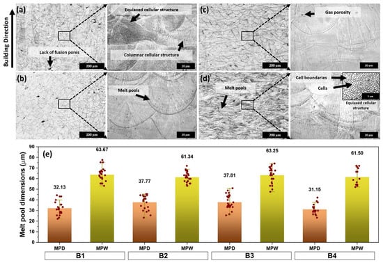 The microstructures revealed after etching the cross-sections of the B1, B2, B3, and B4 specimens are presented in Figure 5a–d, respectively. All of the LPBF specimens exhibited melt pool and melt pool boundaries. All of the LPBF specimens with different island sizes showed decent overlap between the built layers, indicating that island size may not have any influence on microstructure, due to complete melting between layers and tracks. The B1 specimen exhibited a high density of lack-of-fusion pores, particularly along the melt pool boundaries. The density of the lack-of-fusion pores was reduced with increased island size. All of the LPBF specimens exhibited sub-grain or cellular network structures viewed as equiaxed and columnar cellular structures [4,16], as presented in the high magnification micrographs of Figure 5. Figure 5e illustrates the histogram of melt pool depth (MPD) and melt pool width (MPW) of B1, B2, B3, and B4. All of the LPBF specimens exhibited similar melt pool dimensions, i.e., ~30–40 µm MPD and ~60–65 µm MPW. Additionally, the cell diameter size of B1, B2, B3, and B4 was <2 µm. Overall, it was observed that island size had no influence on melt pool dimensions or cell dimensions.