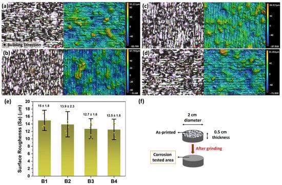 Surface profilometry micrographs presenting the as-printed surface of the (a) B1, (b) B2, (c) B3, and (d) B4 specimen and their corresponding (e) surface roughness. (f) Schematic representation of the specimens.