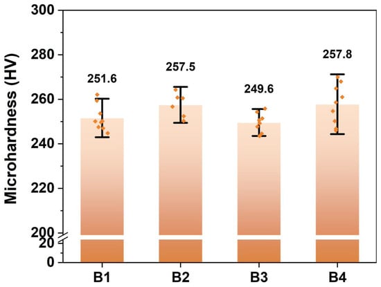 The microhardness of the B1, B2, B3, and B4 specimens is given in Figure 7. The microhardness values of the LPBF specimens were between ~(240–270) HV. All of the LPBF specimens exhibited similar average microhardness, and no trend in the microhardness of different LPBF specimens was observed.