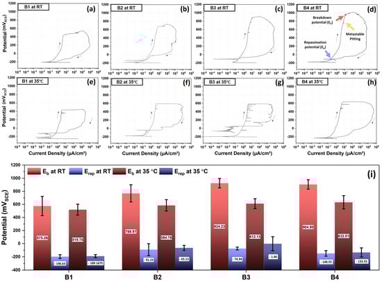 Cyclic potentiodynamic polarization of the B1, B2, B3, and B4 specimens was conducted at (a–d) room temperature (RT) and (e–h) 35 °C, respectively, in 3.5 wt% NaCl. (i) Bar graph presenting the breakdown potentials (Eb) and repassivation potentials (Erep) of corresponding graphs.