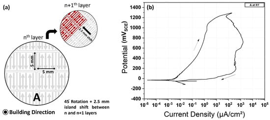 (a) Schematic representation of island scanning strategy followed during laser powder bed fusion of specimen A, and (b) its corresponding cyclic potentiodynamic polarization conducted at room temperature (RT) in 0.6 M NaCl.