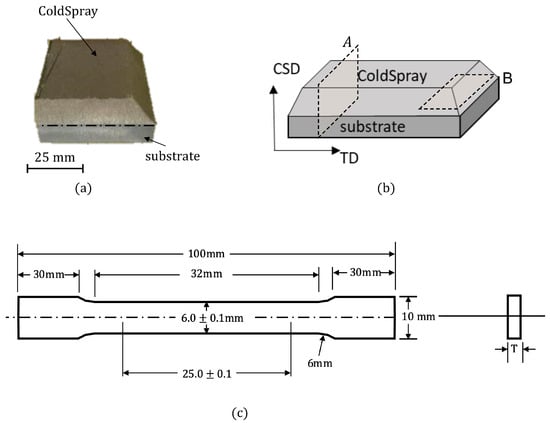 (a) Cold-spray additive manufactured (CSAM) part as obtained, (b) schematic showing orientation of CSAM sample with respect to cold-sprayed direction (CSD) and transverse direction (TD), and (c) ASTM E8 subsize dogbone tension test schematic.