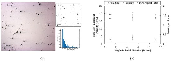 Figure 2a shows the optical micrograph of the polished surface 1 mm away from the substrate of the CSAM Al6061 samples. A MATLAB script was used to compute the area fraction of the pores (porosity), pore size distribution, and pore aspect ratio distribution. The porosity is calculated using the area fraction of the black points from a binary image, as shown in the top right of Figure 2a, and the pore size distribution is shown in the bottom right image of Figure 2a. Meanwhile, Figure 2b shows the porosity, pore size, and pore aspect ratio information averaged using multiple optical microscopy images at build heights of 1 mm, 5 mm, and 9 mm from the substrate. The porosity, pore size, and pore aspect ratio tend to be in a similar range along all build heights. These pores are majorly formed due to gaps in the interparticle (intersplat) regions and are consistent along the different heights of the build direction. The pore aspect ratio is in the range of 1.5.
