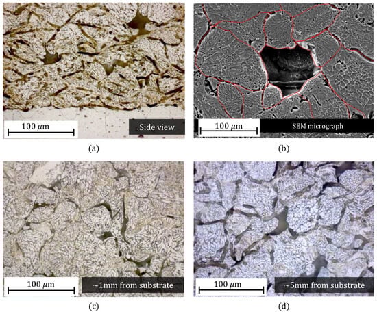 Figure 3 shows the optical microscopy images and SEM micrographs (b) of the etched surfaces of the CSAM Al6061 samples. Figure 3a shows an etched surface with a substrate–powder interface, intersplat boundaries, and grain boundaries from the side view (build direction along the y-axis of the image). Likewise, Figure 3c,d show the OM images taken at build heights 1 mm and 5 mm, consistently revealing distinguished intersplat boundaries, grain boundaries, and pores at the intersplat boundary regions. In the SEM micrograph (Figure 3b), a large pore may have resulted from debonding powder particles during the etching process. Similar to the OM images of the polished samples (see Figure 2), the pores are predominantly present at the intersplat boundaries, consistent along the build height.