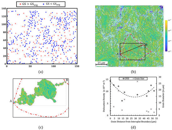 An evaluation of the grain centroids in the CSAM Al6061 microstructure, see Figure 5a, showed that grains smaller than the average grain diameter tend to distribute spatially near the intersplat regions. The large grains were distributed more homogeneously. In addition, the geometrically necessary dislocations (GNDs) map of CSAM Al6061 displayed high dislocation densities near the intersplat boundaries (see Figure 5b). Within a powder particle shown by the dashed red line, the average dislocation density, grain size, and distance from the boundary (starting from the left of Figure 5c) are calculated and plotted in Figure 5d. The dislocation density is higher for the grains closer to the intersplat boundary, and the grain sizes follow the inverse trend.