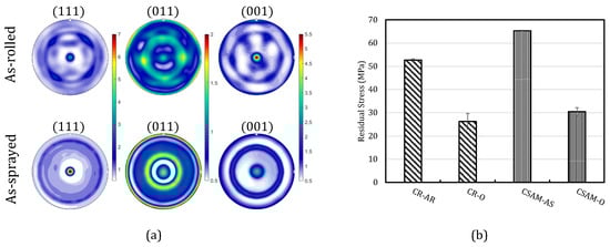 (a) Pole figures obtained from X-ray diffraction (XRD) scans for rolled and CSAM Al6061. (b) Residual stress measurements from XRD scans for rolled, rolled-annealed, as-sprayed, and annealed CSAM Al6061 (diagonal and vertical stripes correspond with rolled and cold-sprayed samples, respectively).
