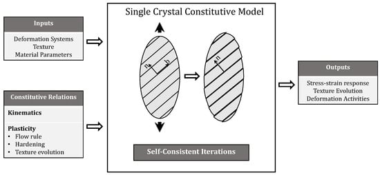 and are the overall (macroscopic) magnitudes and and are the macroscopic viscoplastic compliance and back-extrapolated term, respectively. is the deviatoric strain rate, is the deviatoric stress, and is the eigenstrain-rate field. The input for the code requires the information for the initial crystallographic texture; single crystal properties; initial morphological texture; boundary conditions; as well as parameters for convergence, precision, and run type [52]. These inputs were acquired using the experimental procedures outlined in Section 2. Figure 7 shows the schematic of the inputs, process, and outputs for the VPSC model. For VPSC simulation, the experimental data for ARL samples are used.