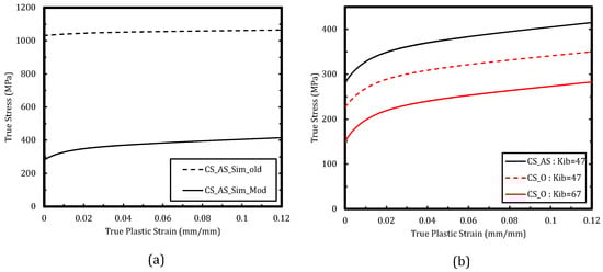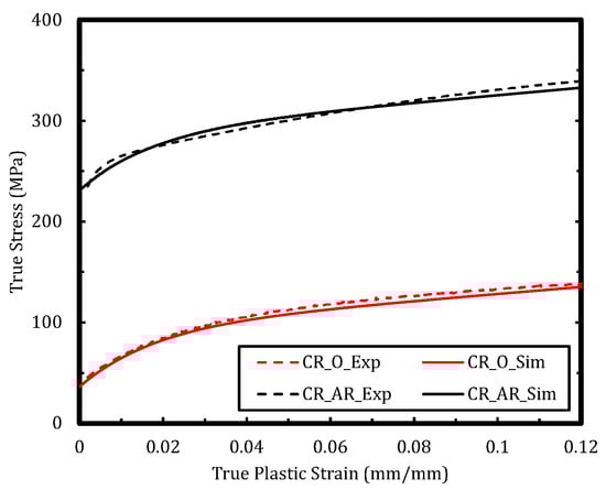 Figure 8 shows the calibrated stress–strain plots for the VPSC simulation in tension along the rolling direction for the as-rolled (CR_AR) and annealed (CR_O) Al6061 with the experimental uniaxial tension data in the rolling direction. The calibrated values for Al6061 are shown in Table 4. As shown in Figure 8, after calibration, the stress–strain response from the VPSC simulation results matches well with the experimental values.