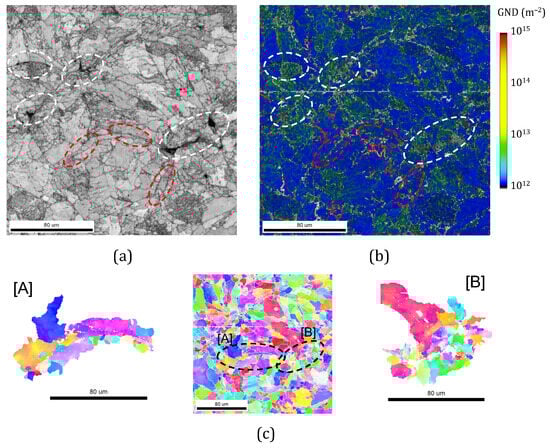 (a) Image quality, (b) geometrically necessary dislocation (GND) density, and (c) inverse pole figure (IPF) map showing areas of strongly bonded regions and poorly bonded regions in annealed cold-sprayed sample. White-dotted regions show pores at the intersplat boundary, and red-dotted regions show areas with good bondings.