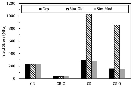 The experimental, simulated, and modified simulated yield stress values compared for the rolled and cold-sprayed materials in their as-received and annealed conditions (see Table 3 for more details on experimental results).