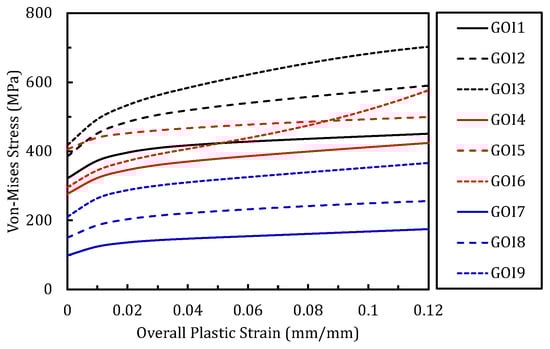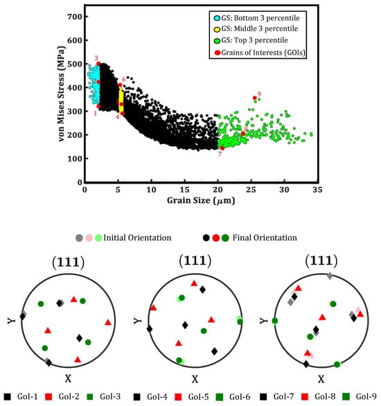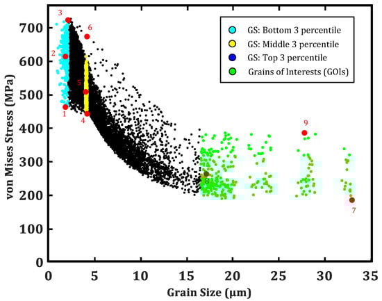 Figure 12 shows a scatter plot of von Mises stress corresponding to grain sizes at the final deformation step of 15% strain. The smaller grains experience higher localized stresses than the larger grains. Out of these grains, nine specific grains of interest (GOIs) are marked within the figure, with the minimum, mean, and maximum von Mises stress at the bottom, middle, and top three percentile of grain size.