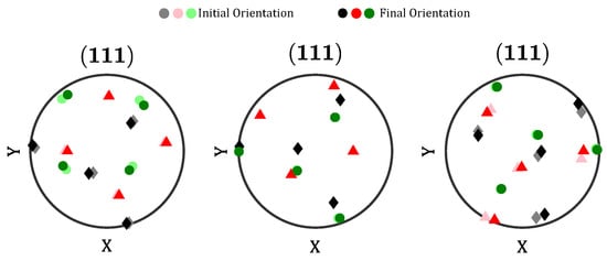 The texture evolution for the annealed modified CSAM Al6061 of each of the nine GoIs taken from the third-percentile data set, as can be seen for the (111) pole. The circles in the figure are colored to reflect the GoI they represent. Three GoIs are marked within each pole for ease of visualization.