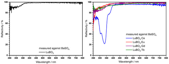 Undoped LuBO3 showed a very high reflectance between 350 and 800 nm, which caused the pure white body color (Figure 4). Below 350, a weak absorption band appeared, which might have been caused by defect centers (Urbach tailing), as the band gap of LuBO3 was about 6.4 eV [10].