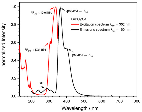 A broad emission pattern with three maxima around 240, 288, and 311 nm can be recognized between 200 and 250, which was probably due to recombination processes of self-trapped excitons (STE) [2]. Furthermore, a broad emission band with two maxima between 350 and 550 nm could be observed. The maxima were around 363 nm and 401 nm. The maxima around 363 nm showed the highest relative emission intensity and was due to a transition from the lowest crystal-field component of the [Xd]5d1 configuration to the ground state 2F5/2. The maxima around 401 nm was due to the transition from the 5d-band to 2F7/2 [2,3,10,11]. Between 500 and 800 nm, there were no further emission bands or lines detectable.