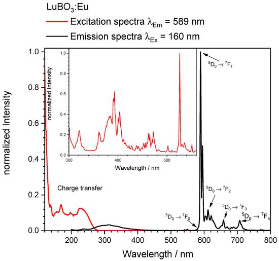 Excitation (red) and emission (black) spectra of Eu3+ doped LuBO3.