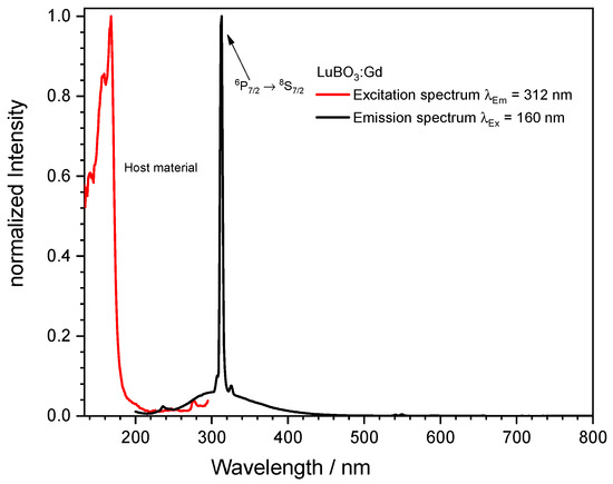 The excitation spectrum shows a peak at 175 nm with a very steep low energy edge. This excitation corresponds to the band excitation of the host matrix, and thus fits rather well to the optical band gap of LuBO3. A single sharp emission line was observed at 312 nm, which can be assigned to the 6P7/2 → 8S7/2 transition. This line overlapped with a broad emission band that was assigned to an STE emission due to defects in the material (see Figure 7).