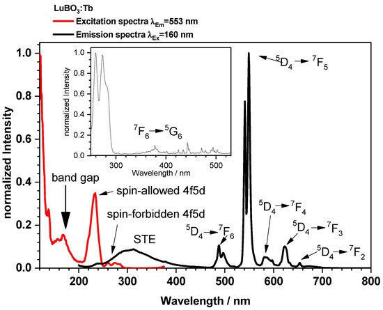 The lutetium orthoborate terbium was also optically characterized in terms of excitation and emission behavior. The results are shown in Figure 8.