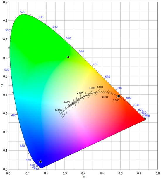 CIE1931 color chart with the x, y color point of LuBO3:Ce3+ (●), LuBO3:Eu3+ (), and LuBO3:Tb3+ ().