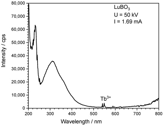 The XES spectra of the undoped LuBO3 are shown in Figure 10. An intense emission band occurred right at the high energy edge of the investigated spectral range. This was followed by two bands, which were observed at 230 nm and 300 nm. The weak lines around 550 nm indicated Tb-impurities and were also present in the Tb-doped sample (see Figure 10). Finally, a steady increase was detected towards longer wavelengths.