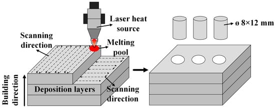 The raw material used in this experiment is Ti6Al4V powder, with particle size of 53–200 μm, which is obtained via vacuum induction melting inert gas atomization (VIGA) provided by Zhejiang TIANTI additive manufacturing technology Co. in Ningbo, China. The substrate used is Ti6Al4V in a hot-rolled state, with dimensions of 160 mm × 160 mm × 20 mm. Before printing, the Ti6Al4V substrate is sand-blasted until the surface turns silvery gray to remove the surface oxide, and the substrate surface is wiped with acetone or ethanol to improve the deposited alloy bond for the substrate. The gun’s distance is set at 50 mm, with a sand blasting angle of 60°. The air pressure for sand blasting is adjusted to 3 bar, and the sand blasting duration is set for 20 min. In this experiment, the Ti6Al4V titanium alloy is prepared using LMD 8060 equipment. The Ti6Al4V specimen is prepared using the laser melting deposition method, with power of 1200 W and travelling speed of 600 mm/min, scanning pitch of 1.6 mm and powder feeding rate of 1.0 rpm/min. This is performed in an argon atmosphere, with the oxygen content kept below 50 ppm to prevent oxidation of the titanium alloy samples during preparation. Using the serpentine reciprocal scanning method for printing, each layer is deposited and rotated 90° for the next layer deposition. The Ti6Al4V block is printed out and machined into a cylindrical specimen of ø 8 × 12 mm via wire cutting, as shown in Figure 1.
