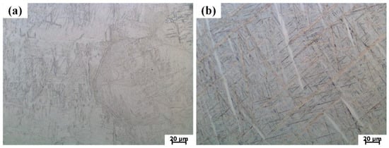 Microstructures of different hydrogen contents at 80 °C and 0.01 s−1 above the phase transformation point: (a) Ti6Al4V, (b) Ti6Al4V-0.72H.