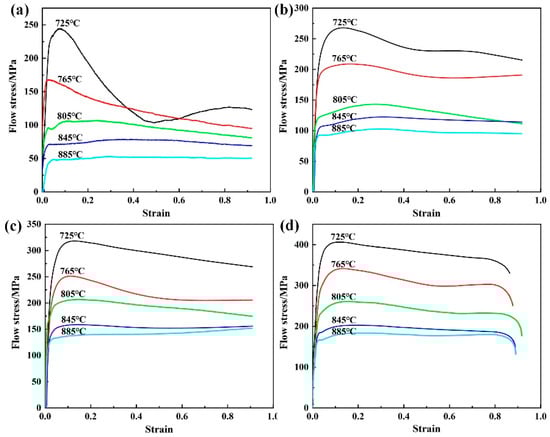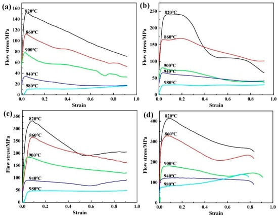 Figure 3 illustrates the stress–strain relationship curve of the Ti6Al4V alloy in the absence of hydrogen addition. As the strain increases, there is a sharp rise in flow stress due to work hardening during initial deformation. Subsequently, there is a gradual decrease in flow stress caused by softening behavior. In the later stages of deformation, material processing and dynamic softening counteract each other, resulting in a steady-state flow trend. It is also observed that the peak flow stress of the alloy is sensitive to the deformation temperature, exhibiting a decrease with increasing temperature. Figure 3a–d illustrate that at the same deformation temperature, the peak flow stress increases with the strain rate. For instance, at a deformation temperature of 820 °C, the peak stress of the alloy rises from 151.5 MPa to 414.7 MPa as the strain rate increases from 0.01 s−1 to 10 s−1. Similarly, at a deformation temperature of 980 °C, the peak stress increases from 10.5 MPa to 76.5 MPa. These results indicate that higher deformation temperatures lead to greater enhancements in peak stress with increasing strain rate, while lower temperatures result in less pronounced decreases in peak stress.