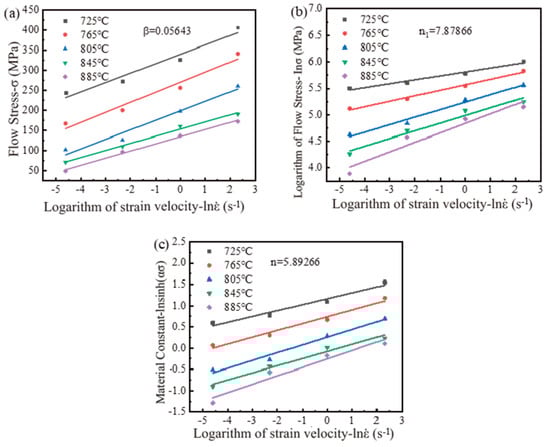 According to Equation (5) above, the linear relationships between , and ln[sinh(α)] − are plotted, respectively, as shown in Figure 5. The difference between the slope values of (a) and (b) in Figure 5 is found to be minor. Therefore, the average values of β and n1 can be calculated separately from the slope. The value of α is then calculated using the formula α = β/n1, so that we can obtain the relationship graph of ln[sinh(α)] − . The average value of n is then found based on the slope of the line in Figure 5c.