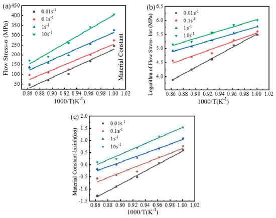 where T is the deformation temperature; ε is the strain rate; is the strain rate; C is the chemical composition; and S is the structural parameter. In the experiment, the chemical composition of the alloy was determined, so that C can be considered as a constant. When the heat deformation parameters are determined, the alloy microstructure characteristics S can also be considered as a constant. Thus, the expression in the above equation can be simplified as [].