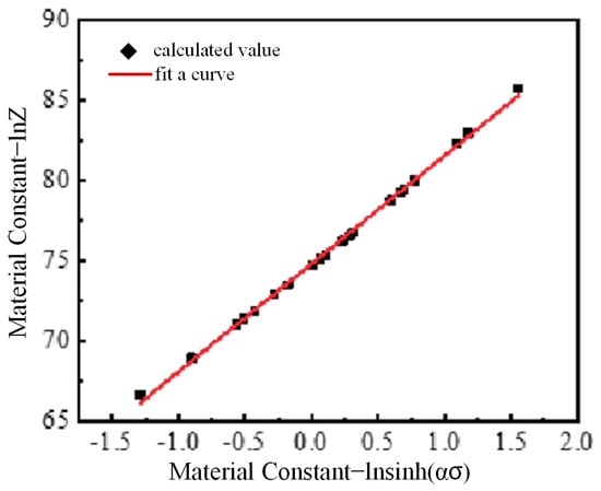 The linear relationships between , and are drawn in a similar way, as shown in Figure 6. Based on the values of β, n1 and n calculated in Figure 5, substitute each of the three values into the above Equation (6) to calculate the value of Q. Finally, Q = 684.74 KJ/mol is obtained, and the calculated value of the deformation activation energy Q is in accordance with the deformation activation energy calculated by Peng et al. []. According to the relationship plot of in Figure 5 above, the corresponding intercept after fitting is . In this expression, Q and n are solved, so the value of can be obtained as 72.717. Substituting Q = 684.74 KJ/mol into the above Equation (4), we can obtain the Z-values under different deformation conditions. After fitting, the final Z-parameter instanton equation is obtained, as shown in Equation (7) below. Figure 7 shows the relationship between and .