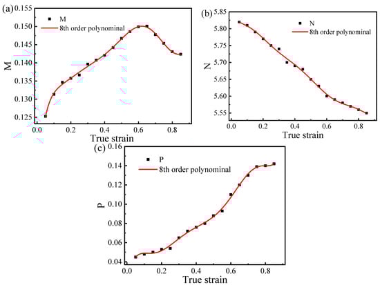 As shown in Figure 8a–c, the scatter plots of M, N and P are shown, respectively, as the strain changes, and then, a suitable polynomial fit is used to obtain the graphs between the strain and each parameter. After a comparison, it was found that the fit between the strain and parameters was better at the highest times of 8 times. The expressions for M, N and P are shown in Equations (11)–(13) below []: