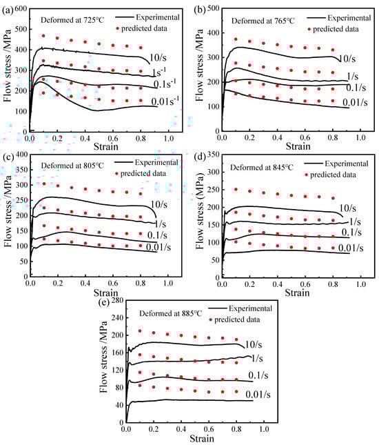 Comparison of simulated and experimental values at different deformation temperatures (a) 725 °C; (b) 765 °C; (c) 805 °C; (d) 845 °C; (e) 885 °C.