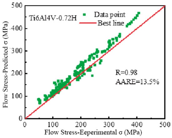 Figure 10 shows the diagram between the experimental and predicted stress values of the alloy obtained for Ti6Al4V-0.72H, where the red line is the correlation line, and the green points are the experimental data points measured by the multiple linear regression model. When the green data points on the graph are closer to the red straight line, this means that the experimental stress value and the stress value calculated by the multiple linear regression model are also closer, and the correlation between the experimental value and the predicted value is better. In the figure, R = 0.98, AARE = 13.5%. The high value of the correlation coefficient R and the small average relative error indicate the high accuracy of the multiple linear regression equation for this alloy. The alloys have small errors and can be used to predict the flow behavior of the alloy at high temperatures.