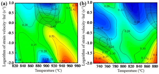 Hot processing maps of alloys with different hydrogen contents: (a) Ti6Al4V, (b) Ti6Al4V-0.72H.