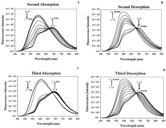 Figure 12 shows the fluorescence spectra of [Pt(tpy)Cl](PF6) nanocrystals (λex = 436 nm) before and after exposure to MeCN vapor. Exciting the nanocrystals at 436 nm results in a consistent broad fluorescence band centered at 565 nm. Exposing the nanocrystal to MeCN vapor in a sealed chamber results in a slight decrease in intensity at 565 nm during initial MeCN absorption, but a red shift was observed from 565 to 585 nm. This exposure led to a broad fluorescence band with a maximum fluorescence at 715 nm and a shoulder near 580–585 nm (Figure 12A) due to the formation of an intermediate structure of solvated [Pt(tpy)Cl](PF6) nanocrystals. The red shift in the fluorescence band is consistent with an increase in Pt…Pt interactions [31]. During desorption, upon removal of the MeCN vapor source, a decrease in intensity at 715 nm and an increase in intensity at 585 nm were observed (Figure 12B). The intensity of the 585 nm fluorescence band rapidly increases over a period of 16 min, but the final fluorescence spectrum differed from that of the initial [Pt(tpy)Cl](PF6) nanocrystals, indicating that the initial nanocrystals could not be restored after desorption. The increased intensity in the 585 nm shoulder with the loss of MeCN suggests that the short wavelength shoulder results from deformation of [Pt(tpy)Cl](PF6) nanocrystals.